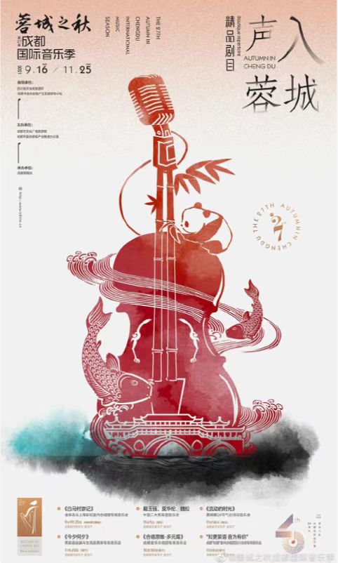 乐器采用了元素拼凑的创意方式,用竹子拼凑成乐器的琴弦,还有熊猫、鲤鱼、建筑等元素的加入,一方面增加了画面的空间层次感,另一方面体现了音乐会举办地的地域特色,起到了文化宣传的作用。