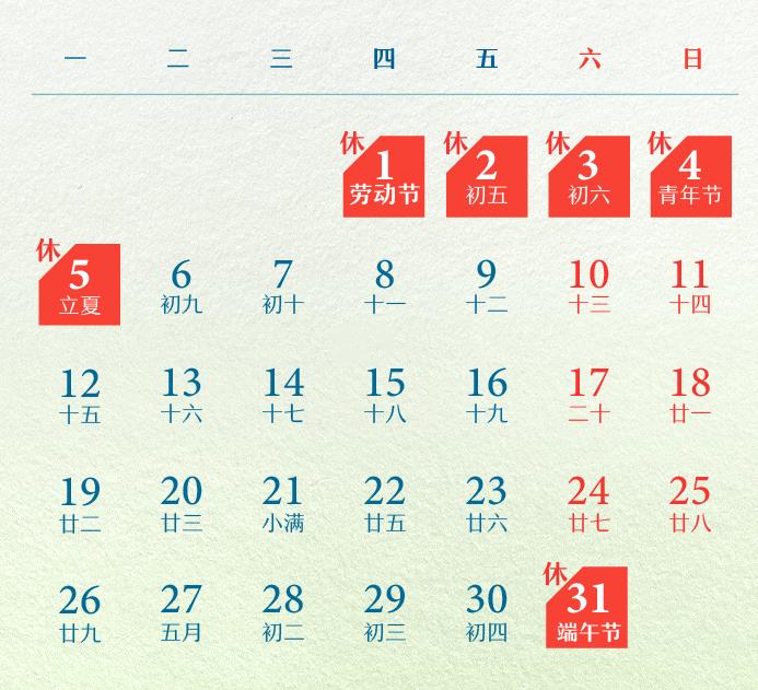 5月1日(周四)至5日(周一)放假调休,共5天。4月27日(周日)上班。